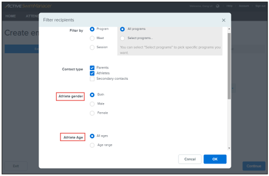 When sending emails, you have an option to send it to specific Meet or Program participants. Below are the steps on how to use Custom filter for participants as recipients in Swim Manager